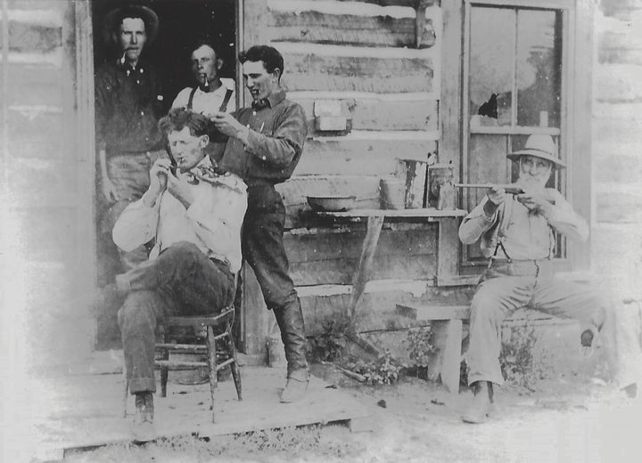 This photo was taken in front of the Brock Livestock Bunkhouse. Lloyd Brown and Henry Mayer are in the doorway, Ernest Brock is cutting hair, Brett Stapp is receiving the haircut, and an unknown man, with possibly the last name of Cheeseborough, is holding the rifle.