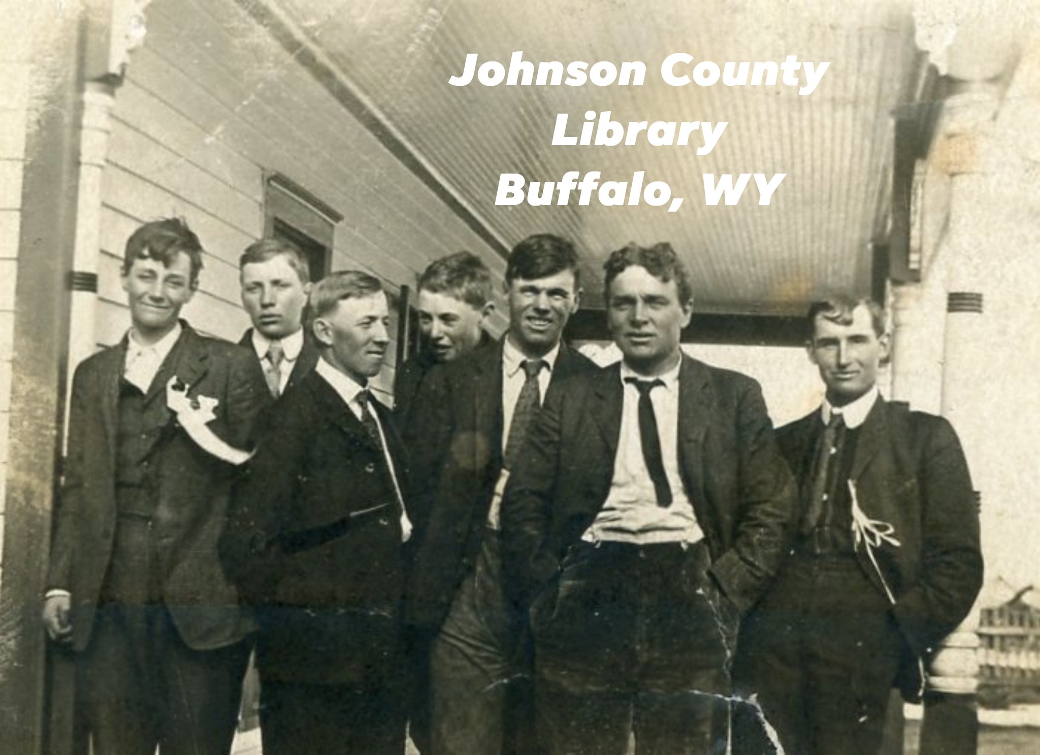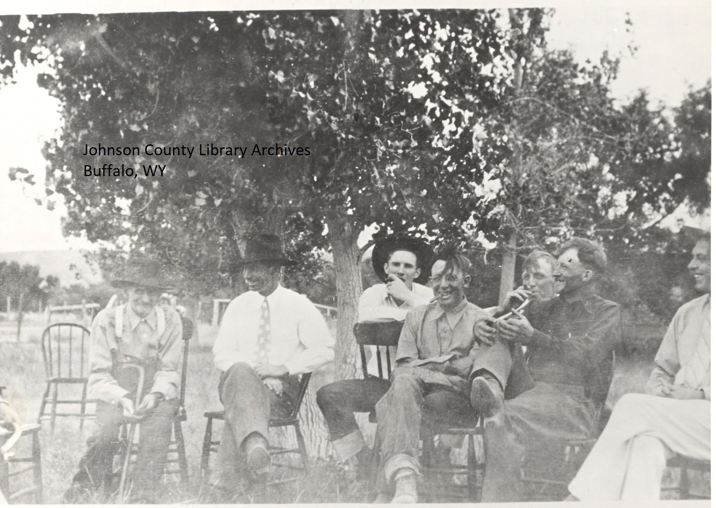 L-R John Greub, John Washbaugh, Ernest Young, Jesse Greub, Ralph Hepp, Frank Lawrence, unknown