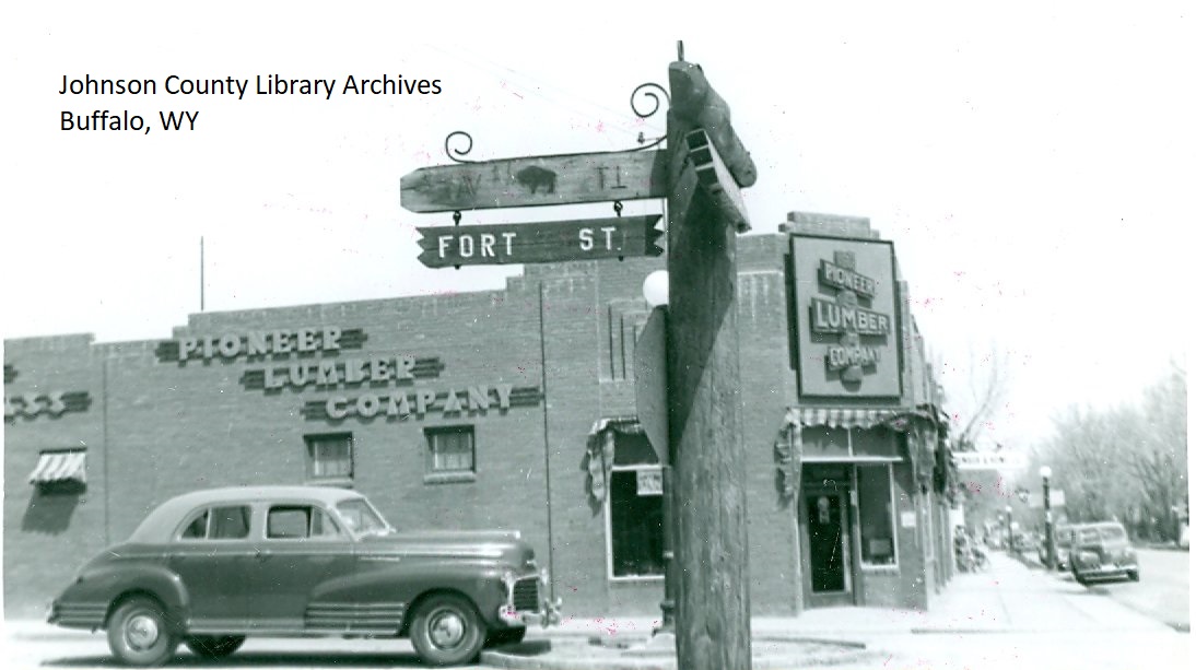 This building, Pioneer Lumber, used to occupy the free parking lot at the corner of Fort and Main just north of the Courthouse. The school administration used after the lumber company, then the county used-road and bridge stored tires and etc in the back. Then the library used-the children's department and for local history and stored book sale books. The library used the building as an annex for several years after Pioneer Lumber closed. There were 2 lumber yards on that lot. The W.F. Smith Lumber Co. was next door north of the Pioneer