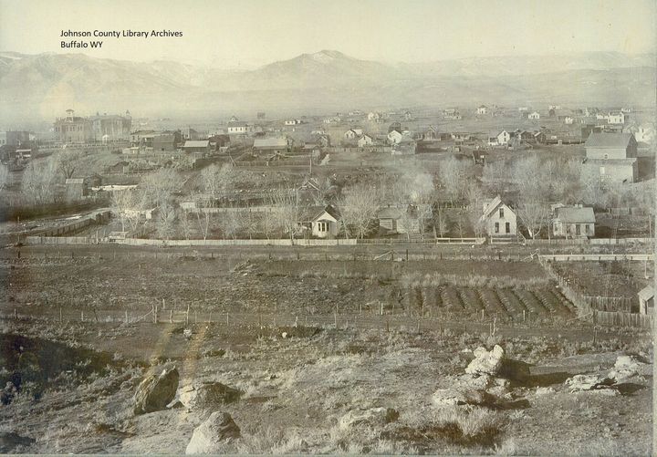 Buffalo Wyoming late 1890's looking over the town towards the west from the hill above town. Courthouse is on the left, the old flour mill is on the far right.