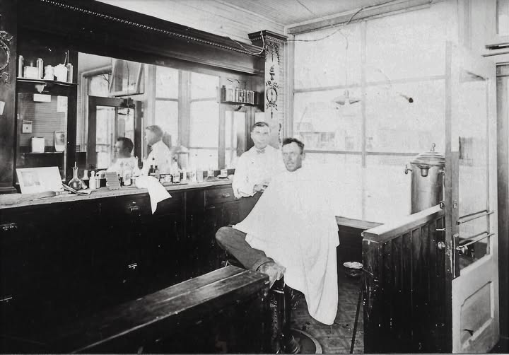There was a barbershop in the Kaycee Hotel at one time. George Diekens was the barber, and Earl Sutton was the customer in this photo