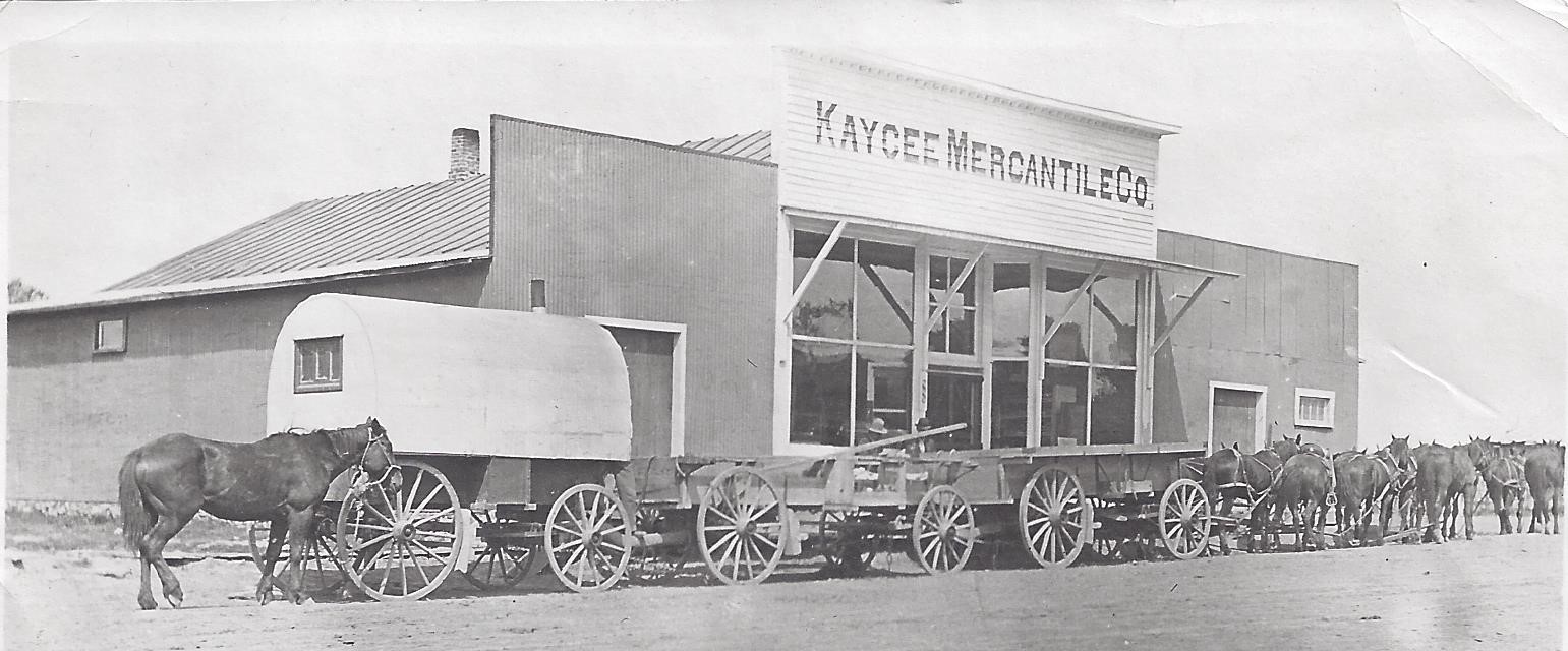 1914 Picture of Kaycee Mercantile. Bill Stubbs and Alice Ullery Stubbs owned the Kaycee Mercantile in early 1920‘s. Samuel and Clara Ullery resided in the lean-to on the north side of the building for a short time while they filed on their homestead at Nine Mile. This is now the Hoofprints of the past Museum.