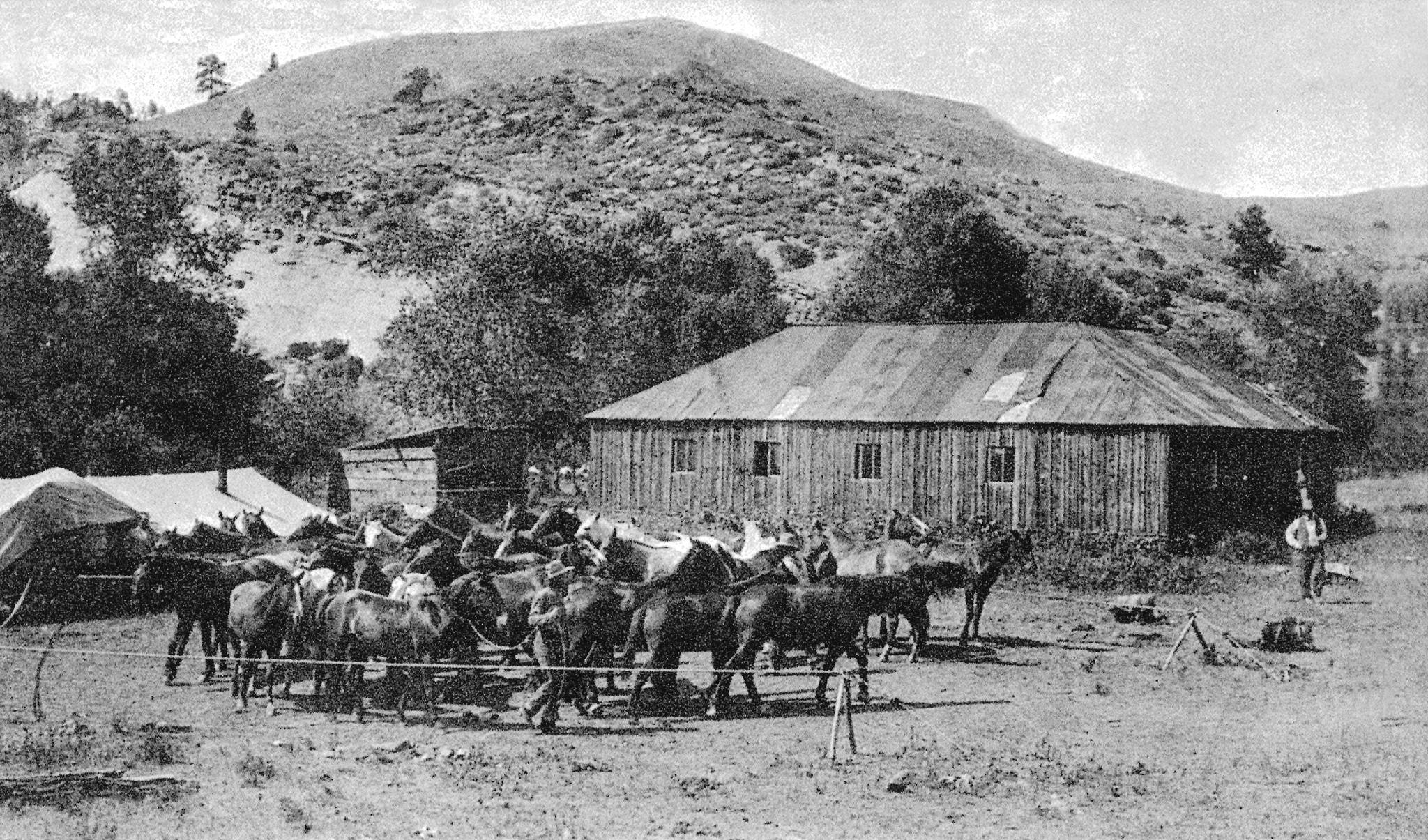 This is a photo of the dance hall at Dance Hall Flat at the Hat Ranch. Dances and Independence Day celebrations were held at the Hat Ranch for many years when it was owned by Lou Webb from 1890-1927. People came from far away as Chicago for the celebration, and there was a picnic, fishing, ice cream making, and of course, dancing.