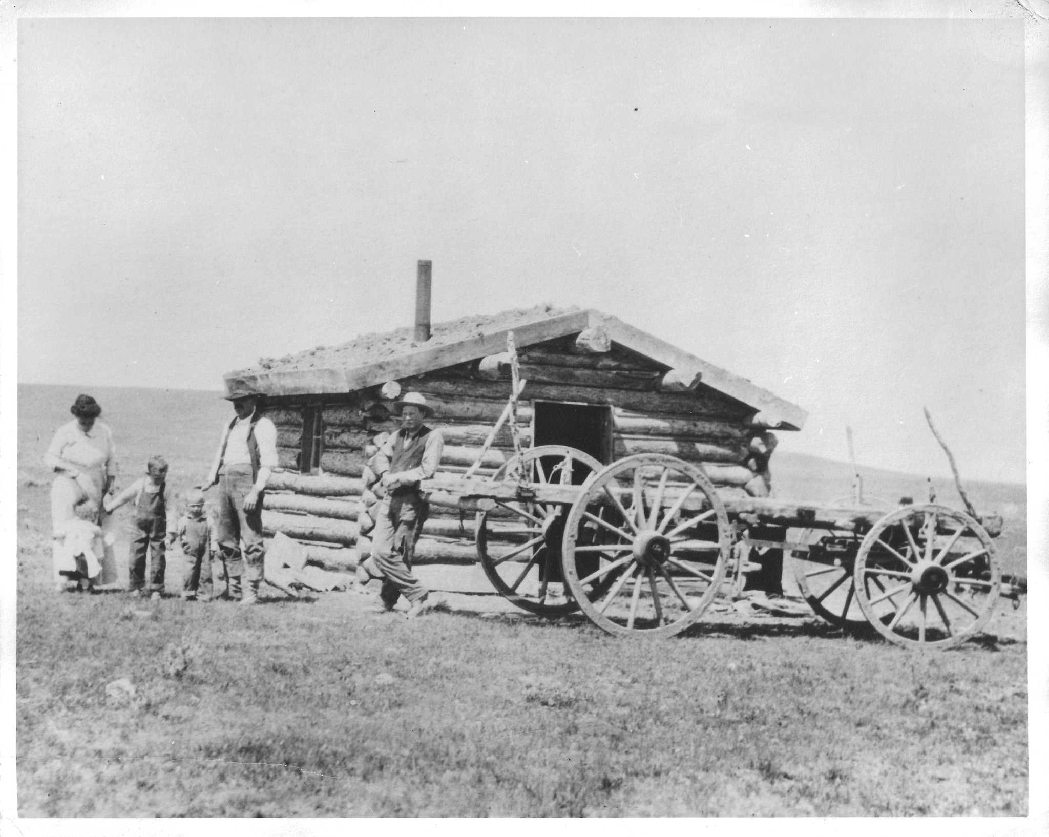 This is the Pete Sacket Homestead on the Mesa in approximately 1915. The cabin was later moved behind the main house at the Carl Sacket homestead (today the Gordon Ranch) to be used as a washhouse. Staci Konkel Eckhart says Grandma Brennis is holding her mom's skirt in this picture. She was born in 1916 so this picture was probably taken in 1918.