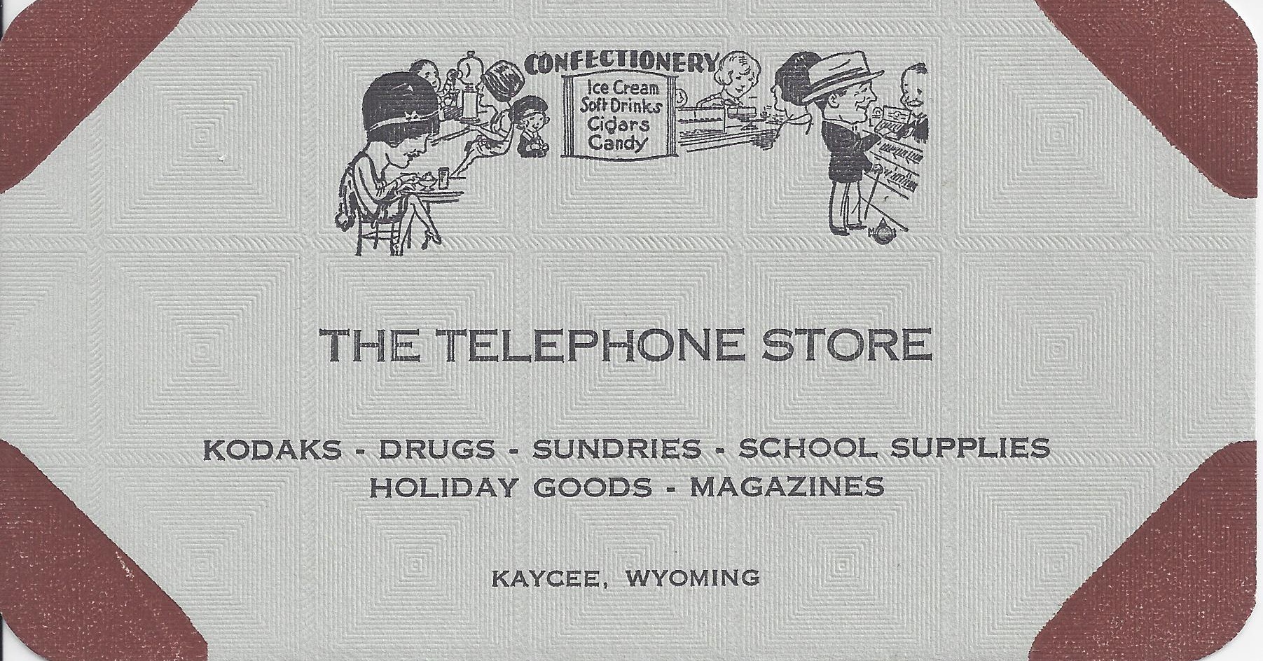 The Telephone Store in Kaycee was a telephone transfer station, with an operator who connected lines for people to speak by phone. Later it became a store and lunch counter, offering various services as shown on the card at right. The photo was taken in 1934.