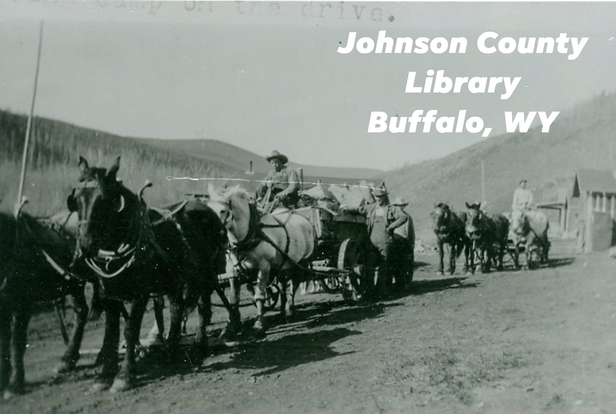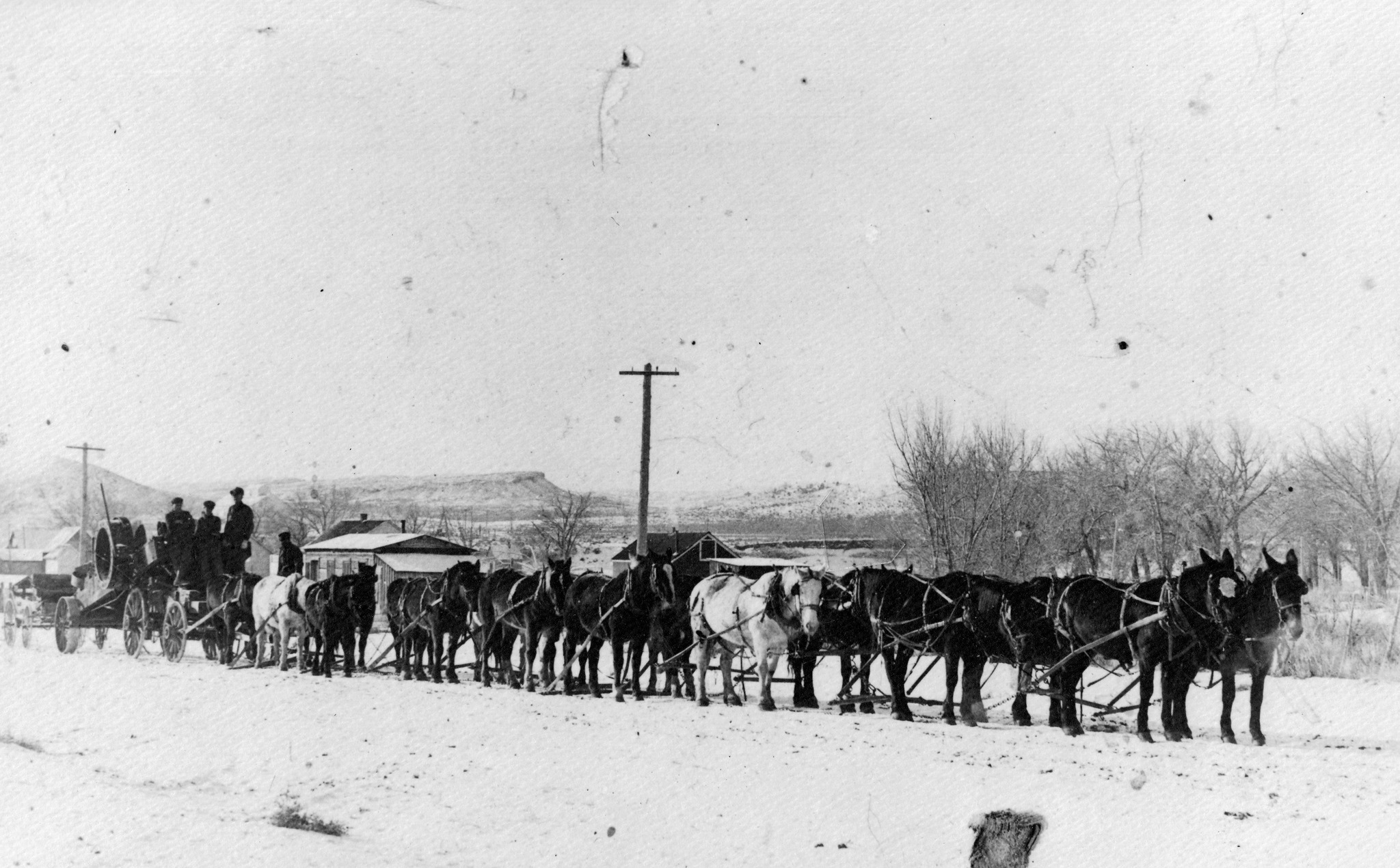 This is a string team hauling equipment on a snowy day in Kaycee in the early 1900's. Gilford James, Leo Gosney, John Rosenberg, and Ray Gosney are named on the photo.