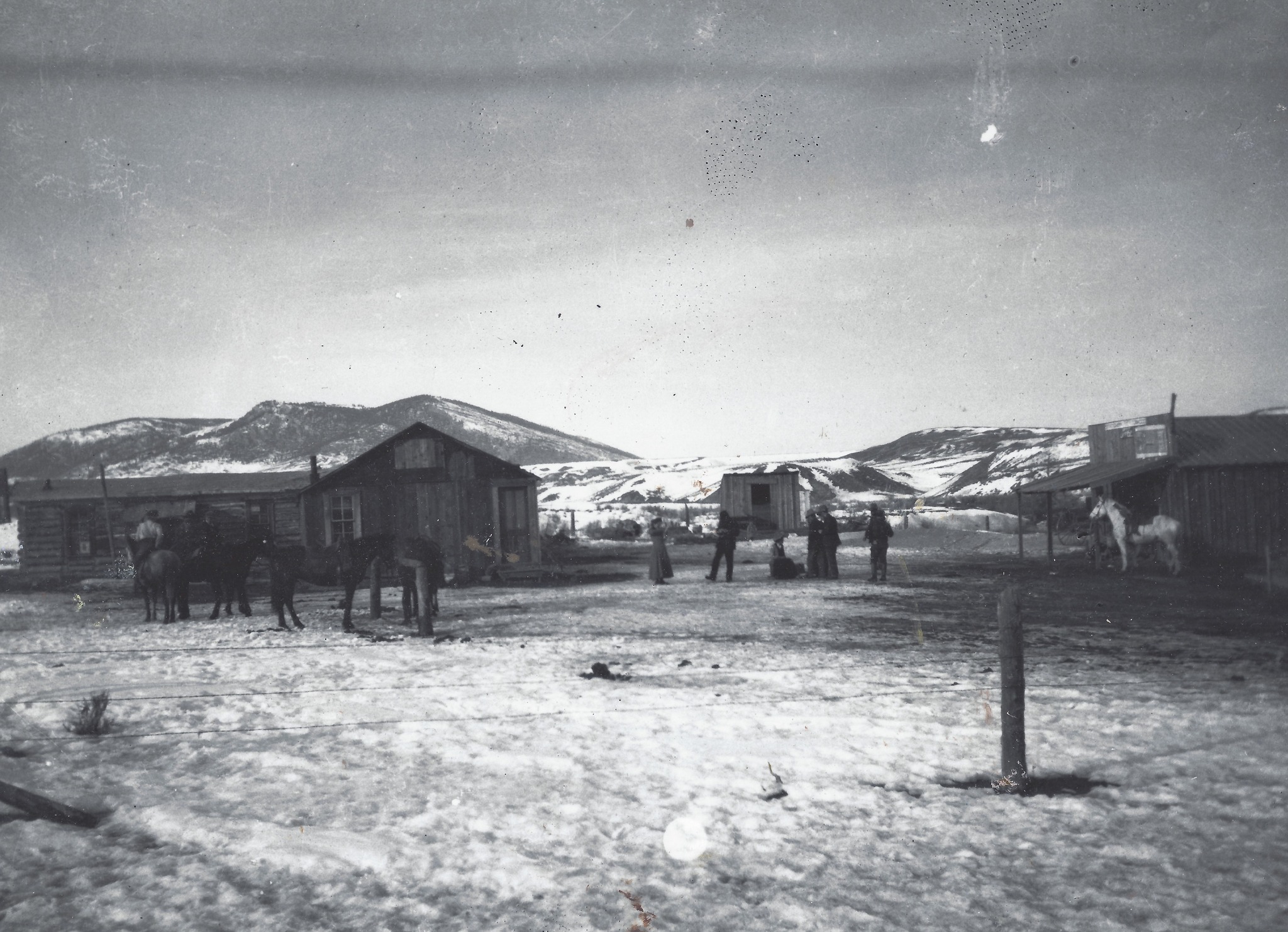 This photo is the Mayoworth Store and Post Office, located 11 miles west of Kaycee. The Horn can be viewed in the background. The history of the Mayoworth store and post office is as follows: In 1902, Mr. Manase became the first post master and later Mr. Cooper, Ben Gallinger, and James Sellars. During Cooper’s term, the Mayoworth dance hall was added to the log residence. Dances were held monthly with Mr. Simmons playing his famous fiddle. While James Sellars was postmaster he converted the hall into a store and Post Office. He needed more space for a store, as he had developed a thriving business (Sellars would later open a store in Kaycee on the lot North of the current museum). Many sheep outfits stopped at the Mayoworth Store for supplies and salt on their way to summer camps in the mountains. James Rinker followed Sellars as postmaster, then came Irene Dalzell and Erma Carr who served from 1929-1944 when the Post Office was discontinued. There was also a stage stop at Mayoworth for a short time and a school nearby to serve the Mayoworth Community which operated until approximately 1955.